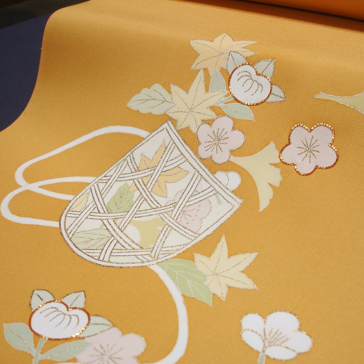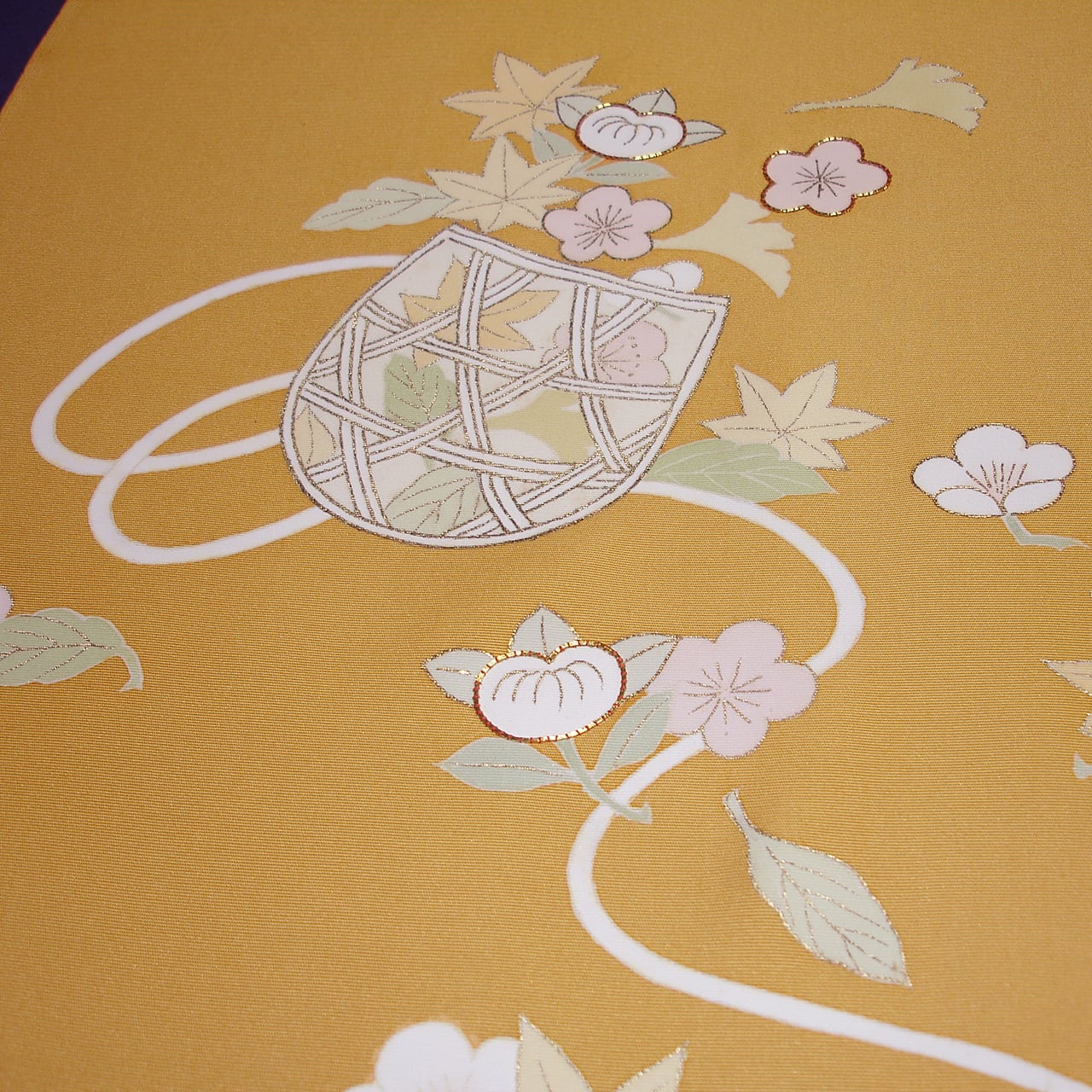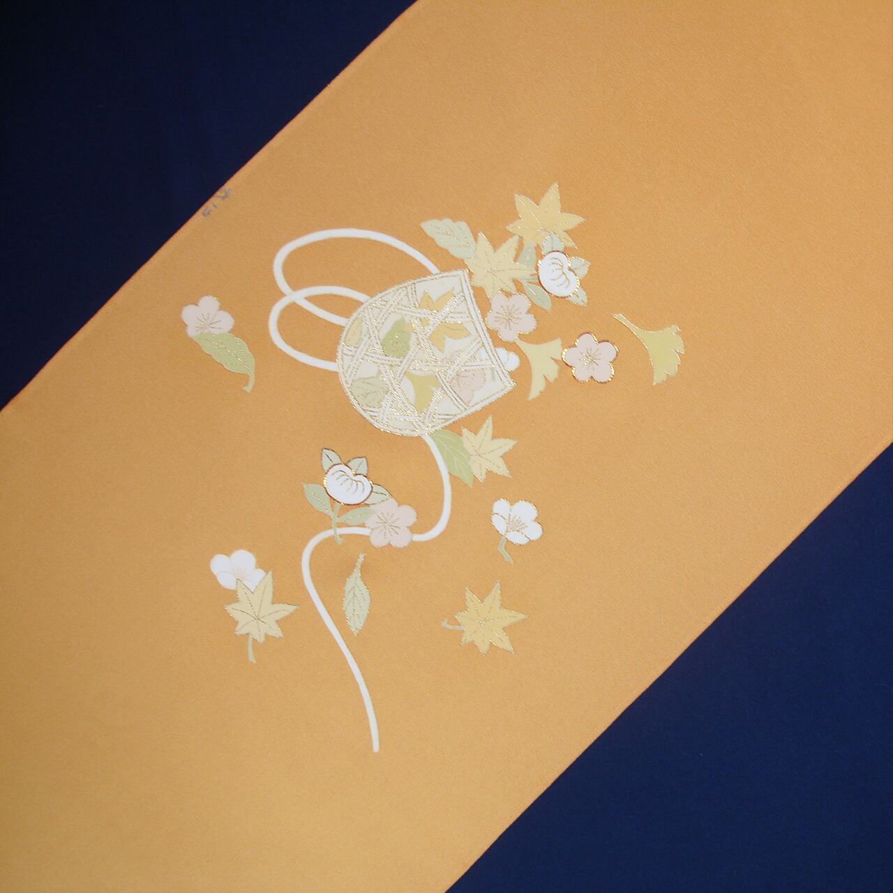 九寸名古屋帯/染 花籠 山吹色 友禅 正絹 塩瀬 染帯
