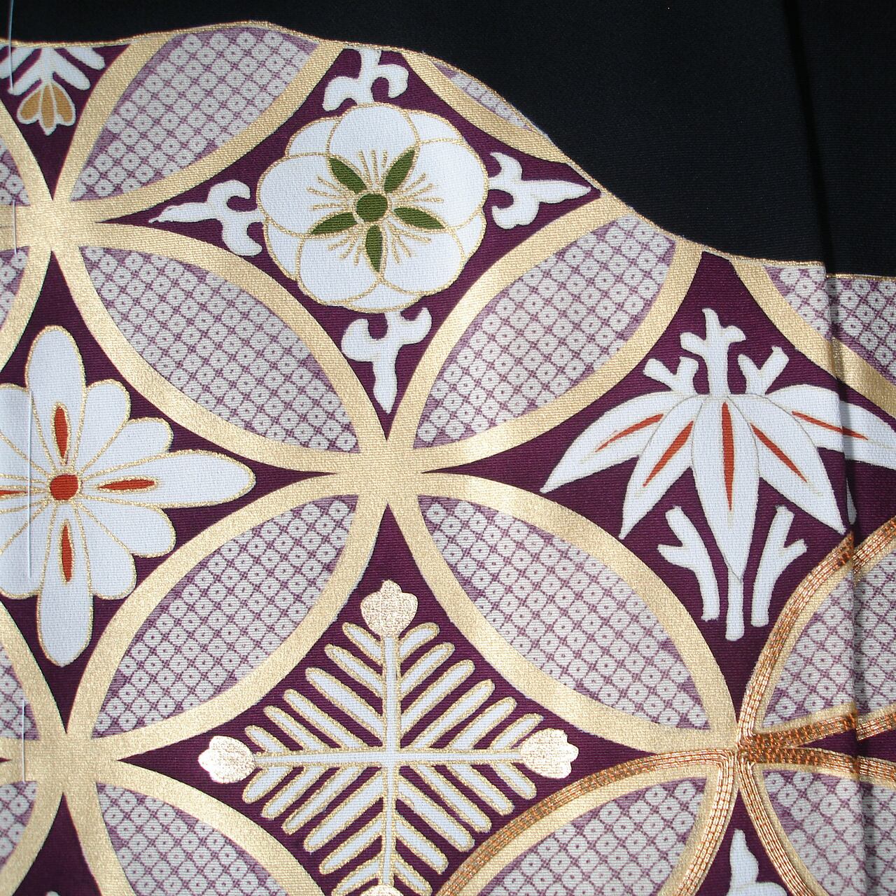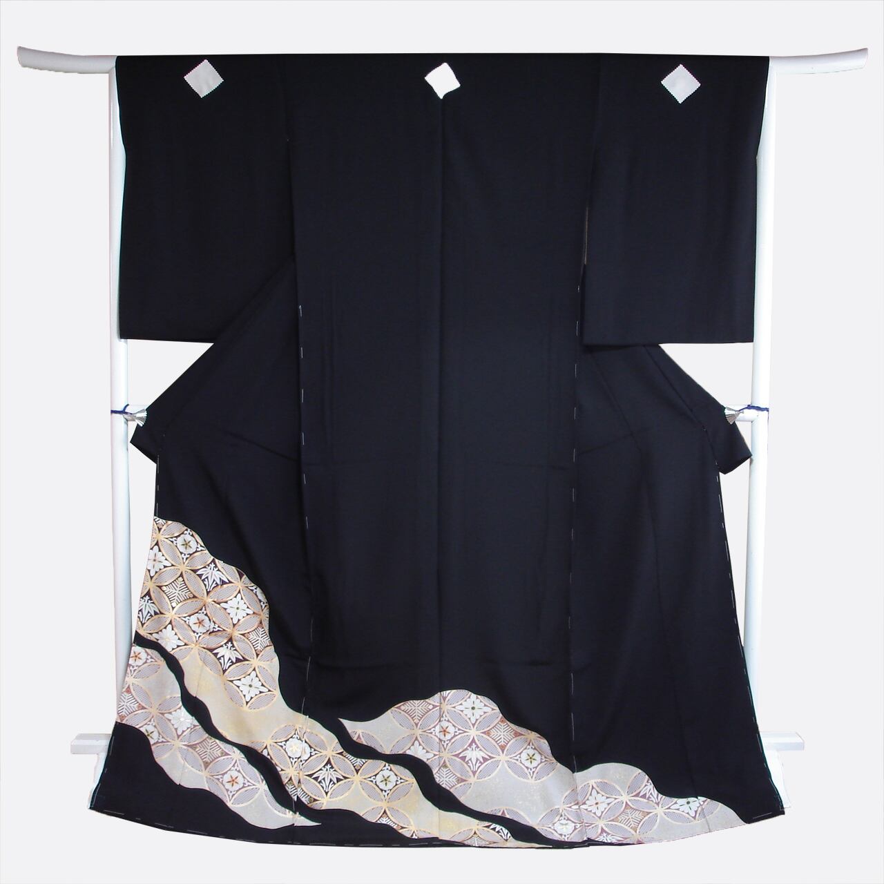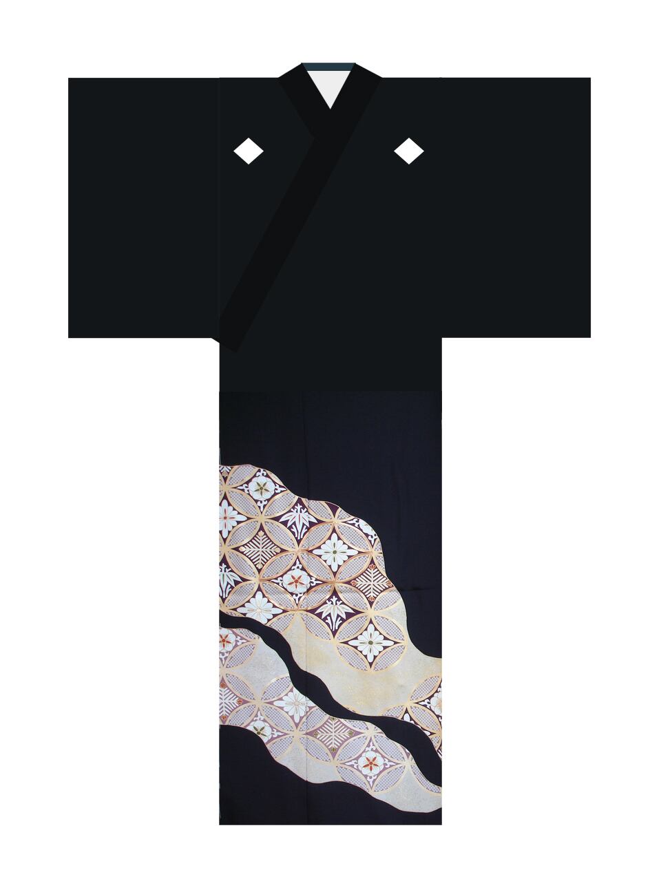 七宝つなぎを道長取りに配した京手描き友禅の黒留袖です。七宝文の中は文様化された松、竹、梅が描かれています。シンプルながら格調のある意匠です。和装の第一礼装を、すっきり、お洒落に着ていただけます。落ち着いた彩色で、着用年齢幅の広いきものとなっています。生地は丹後ちりめんを使用。黒染は、経済産業大臣指定の伝統的工芸士(京黒紋付染)によるものです。