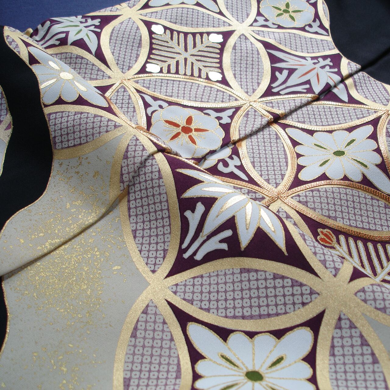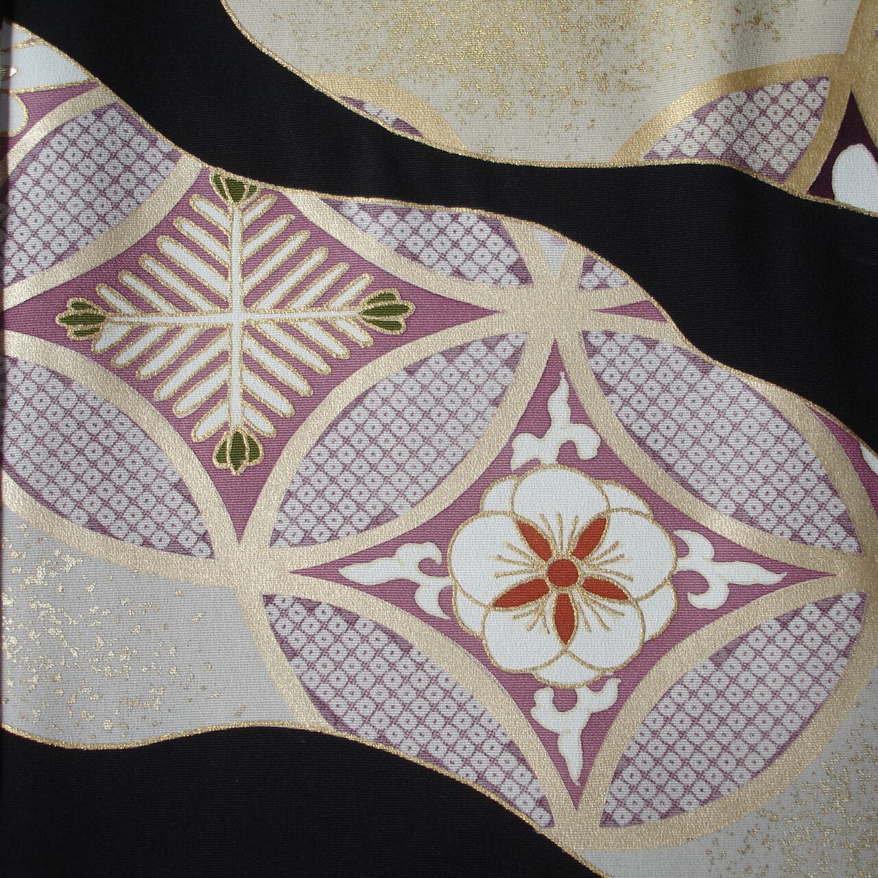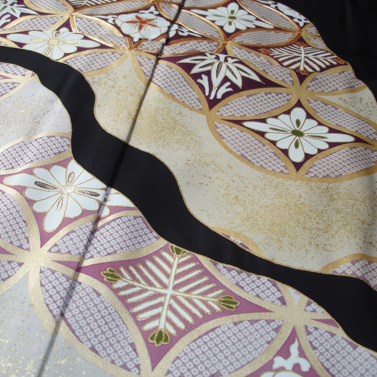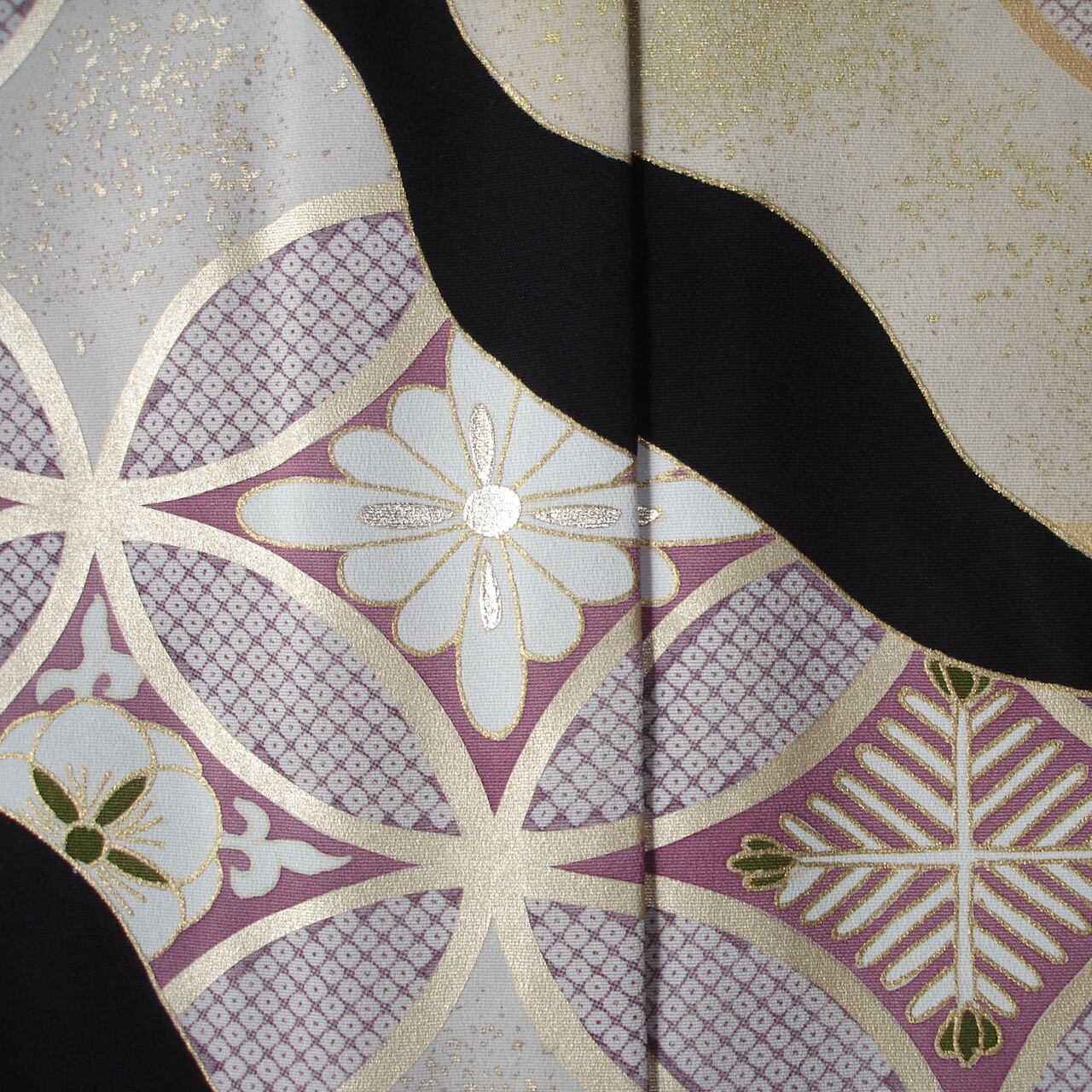 七宝つなぎを道長取りに配した京手描き友禅の黒留袖です。七宝文の中は文様化された松、竹、梅が描かれています。シンプルながら格調のある意匠です。和装の第一礼装を、すっきり、お洒落に着ていただけます。落ち着いた彩色で、着用年齢幅の広いきものとなっています。生地は丹後ちりめんを使用。黒染は、経済産業大臣指定の伝統的工芸士(京黒紋付染)によるものです。