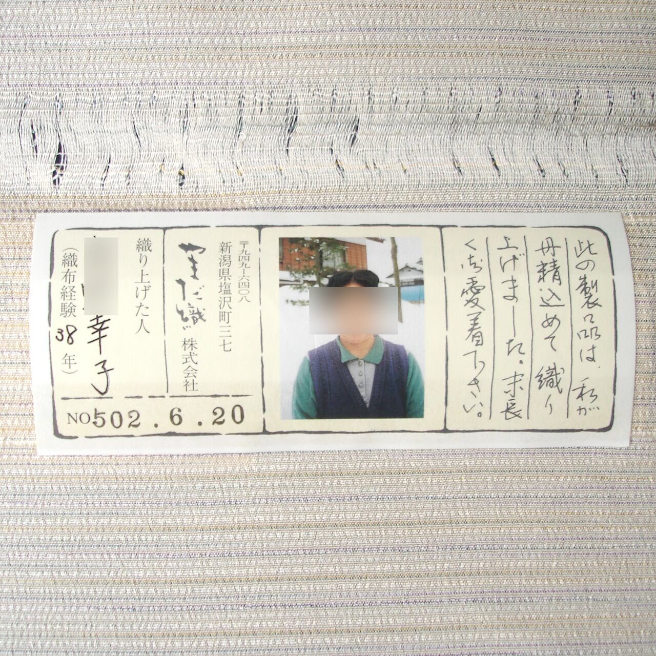 ◎本品は縞織物の本塩沢です。伝統的工芸品の絣の要件を満たしておらず、伝統的工芸品の証紙は添付されておりません。ご留意ください。