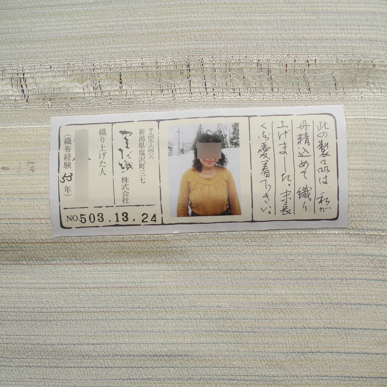 ◎本品は縞織物の本塩沢です。伝統的工芸品の絣の要件を満たしておらず、伝統的工芸品の証紙は添付されておりません。ご留意ください。