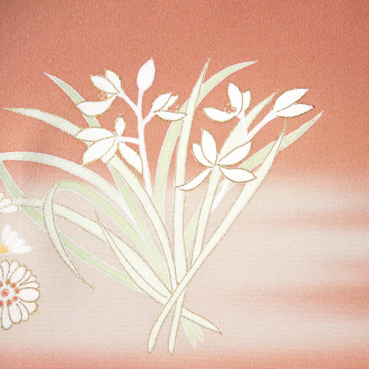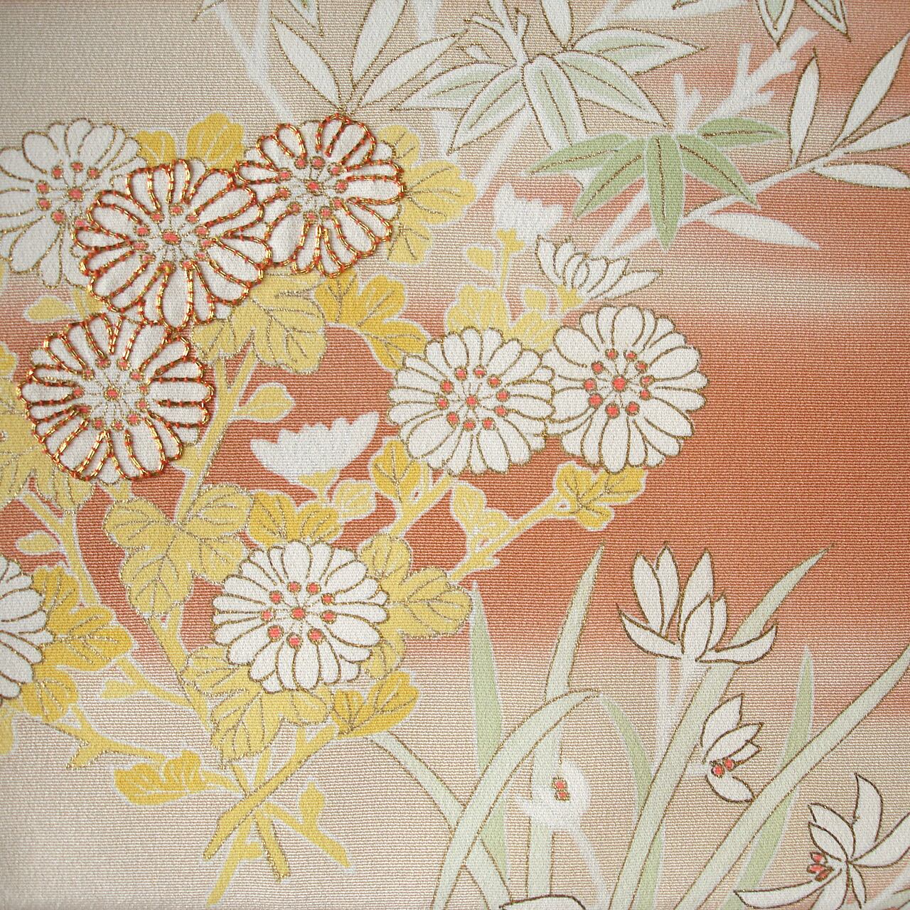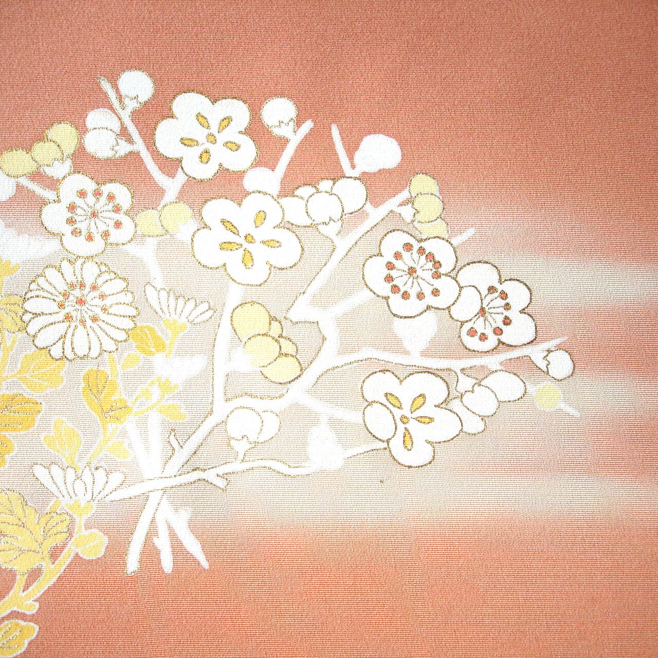 ◎地色は洗朱(あらいしゅ)と呼ばれる、灰みを帯びた薄い朱色です。若い方から中年の方まで、年代広く着用できる地色です。花扇の背景はベージュのかすみぼかしになっており、裾模様に広がり、奥行きを持たせています。