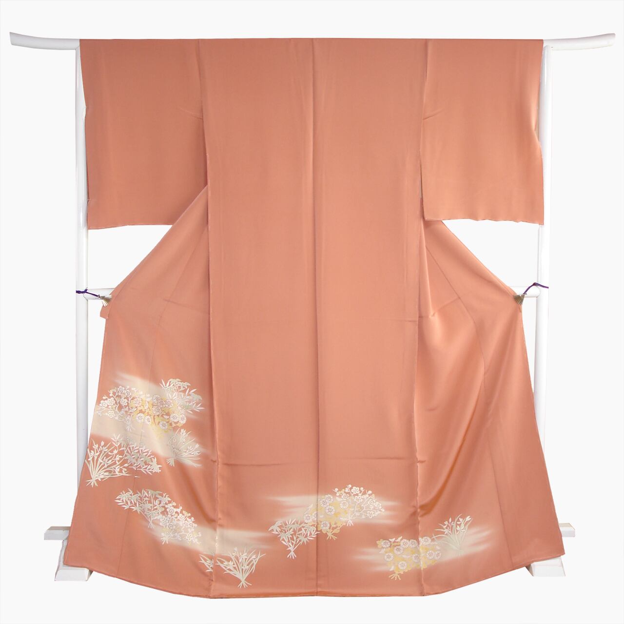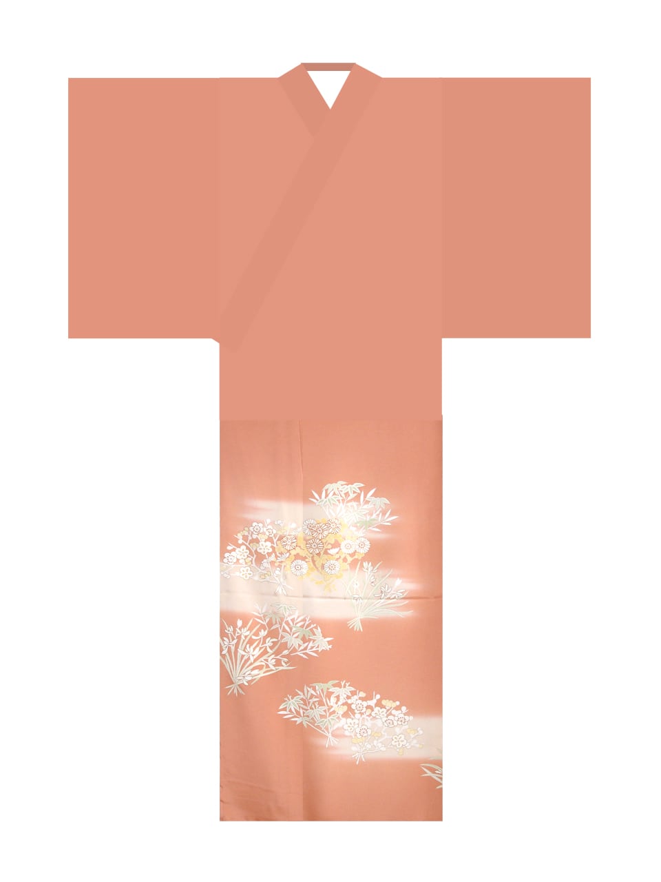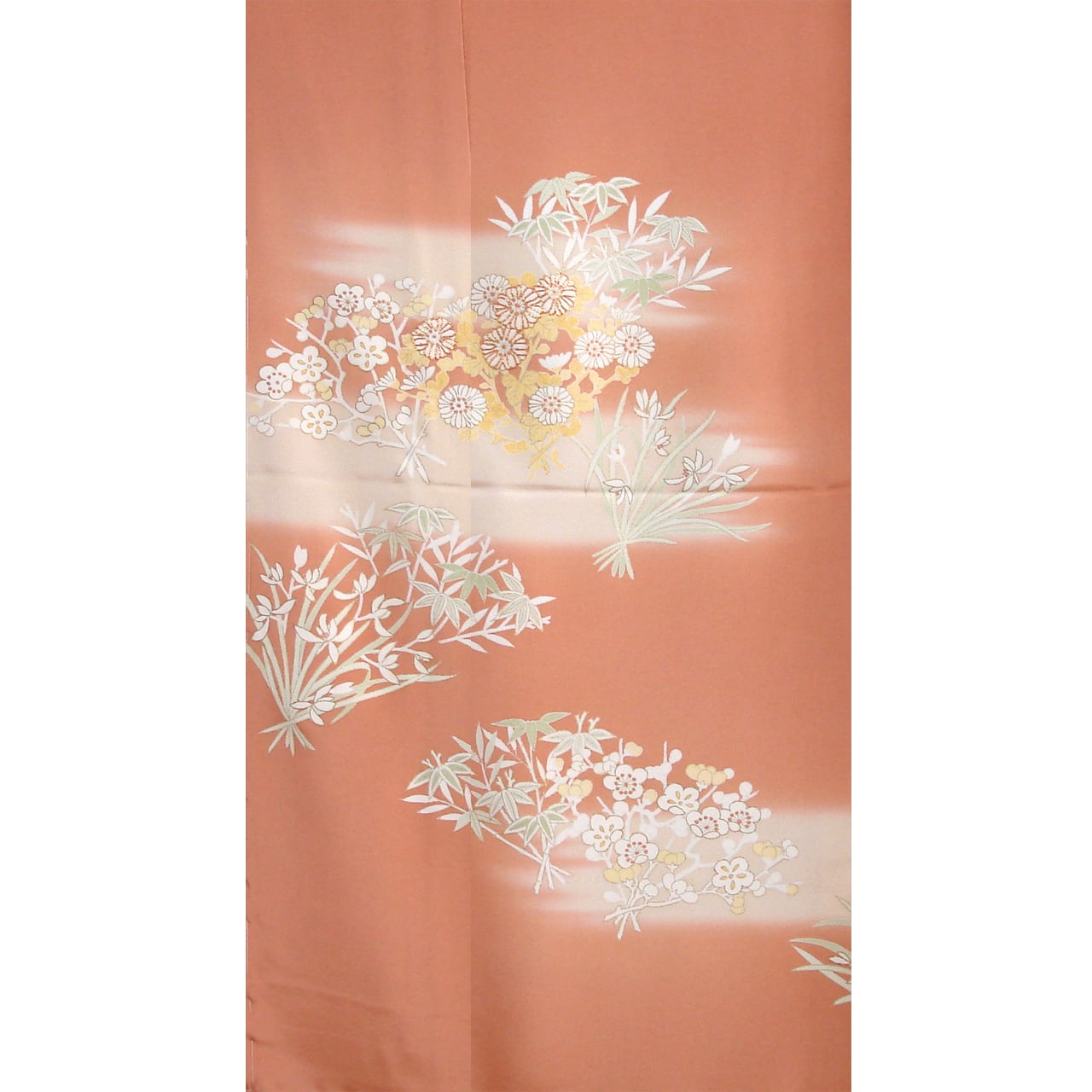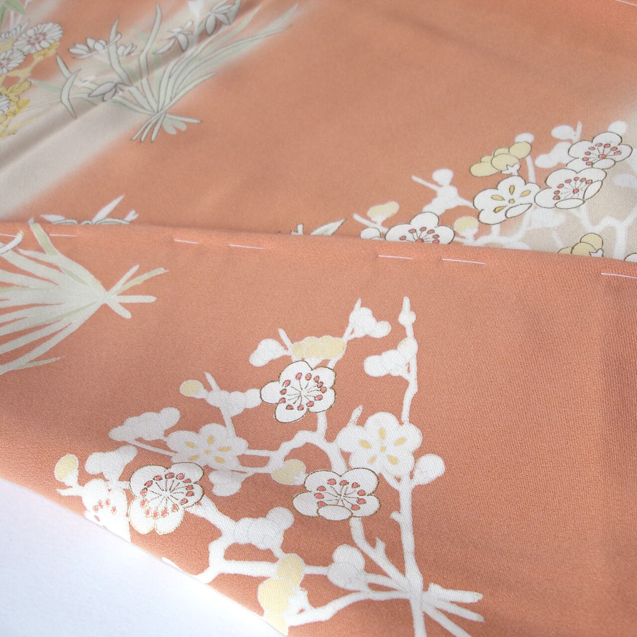 ◎地色は洗朱(あらいしゅ)と呼ばれる、灰みを帯びた薄い朱色です。若い方から中年の方まで、年代広く着用できる地色です。花扇の背景はベージュのかすみぼかしになっており、裾模様に広がり、奥行きを持たせています。